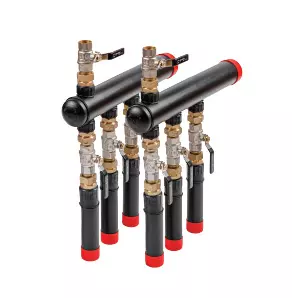 Każda z belek kolektorowych rozdzielacza wielosekcyjnego wyposażona jest w zespół zaworowy odpowietrzający/napełniający typu GW o średnicy ¾” dla układów od 2 do 6 obiegów oraz o wymiarze 1” dla większych rozdzielaczy. Sekcja ta pozwala skutecznie wypłukać, napełnić jak również odpowietrzyć układ dolnego źródła ciepła.